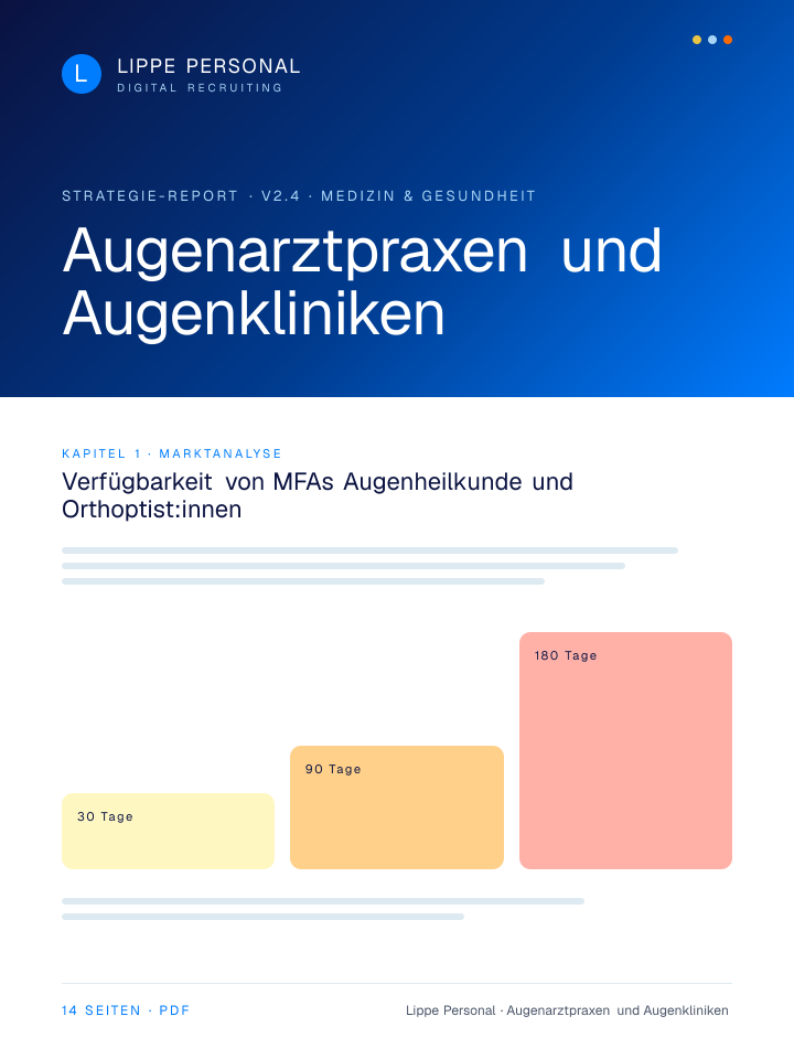 14 Seiten Klartext zur Gewinnung von MFAs Augenheilkunde und Orthoptist:innen. Kostenfrei, branchenspezifisch, sofort per Mail.