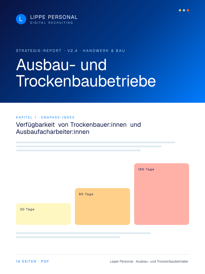 Keine Buzzwords, keine Agentur-Folien. Nur die Zahlen, Vorlagen und der Recruiting-Plan, mit dem Ausbau- und Trockenbaubetriebe aktuell qualifizierte Fachkräfte gewinnen.