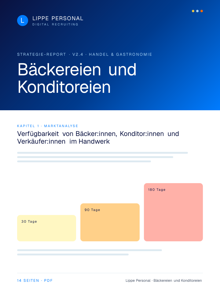 Keine Buzzwords, keine Agentur-Folien. Nur die Zahlen, Vorlagen und der Recruiting-Plan, mit dem Bäckereien und Konditoreien aktuell qualifizierte Fachkräfte gewinnen.