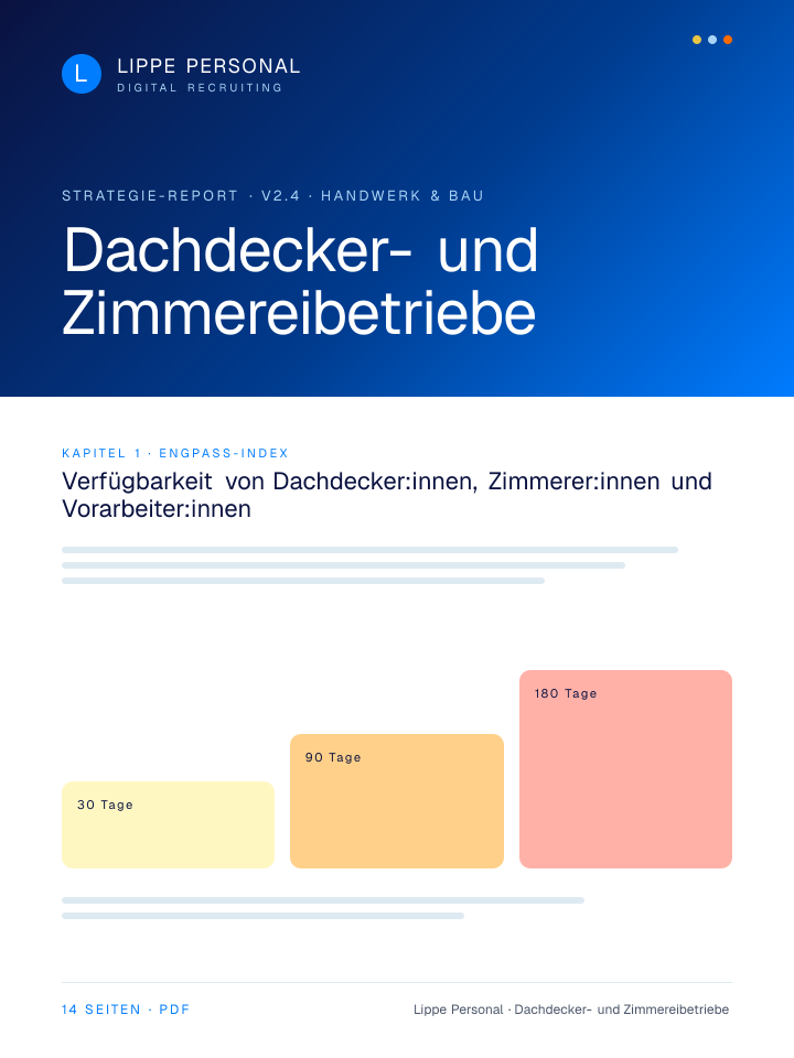 Kostenfreier Strategie-Report — wie Dachdecker- und Zimmereibetriebe in Deutschland aktuell Dachdecker:innen, Zimmerer:innen und Vorarbeiter:innen gewinnen, ohne auf Stellenportale angewiesen zu sein.