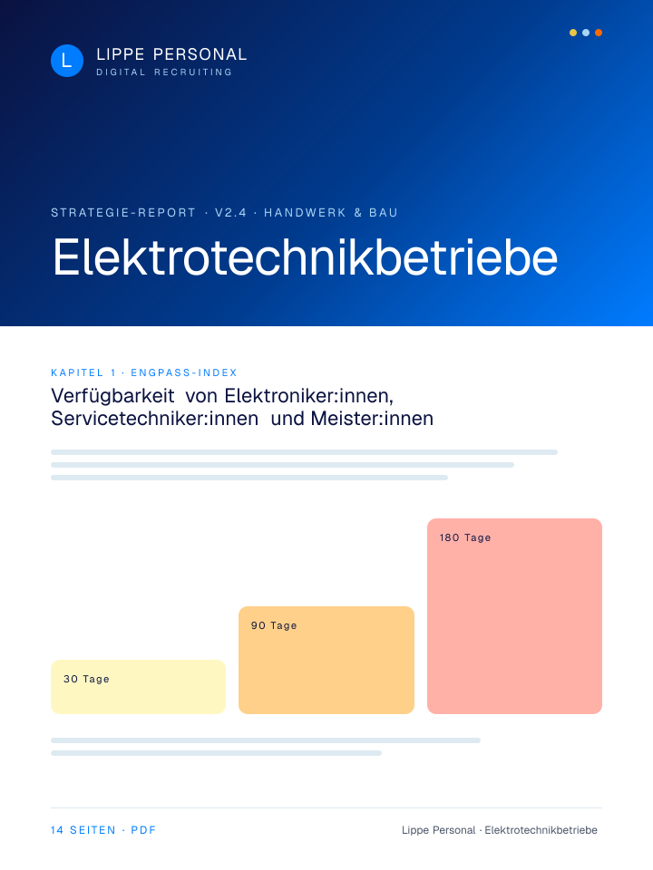 Keine Buzzwords, keine Agentur-Folien. Nur die Zahlen, Vorlagen und der Recruiting-Plan, mit dem Elektrotechnikbetriebe aktuell qualifizierte Fachkräfte gewinnen.