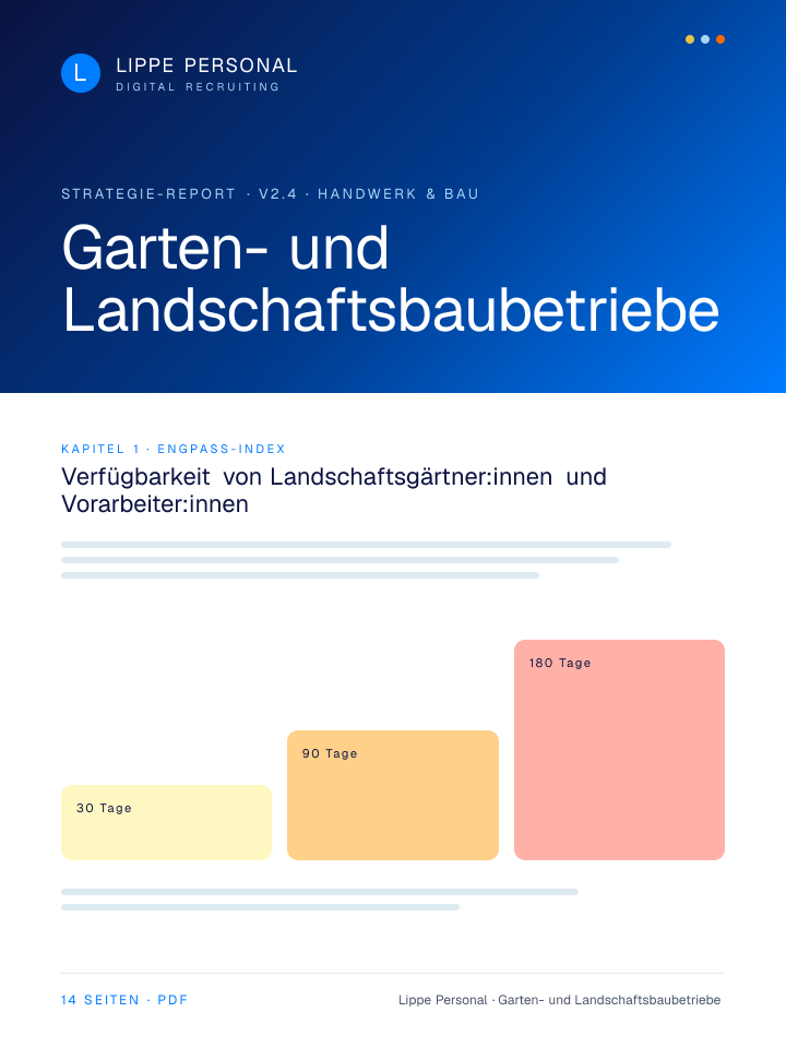 Keine Buzzwords, keine Agentur-Folien. Nur die Zahlen, Vorlagen und der Recruiting-Plan, mit dem Garten- und Landschaftsbaubetriebe aktuell qualifizierte Fachkräfte gewinnen.