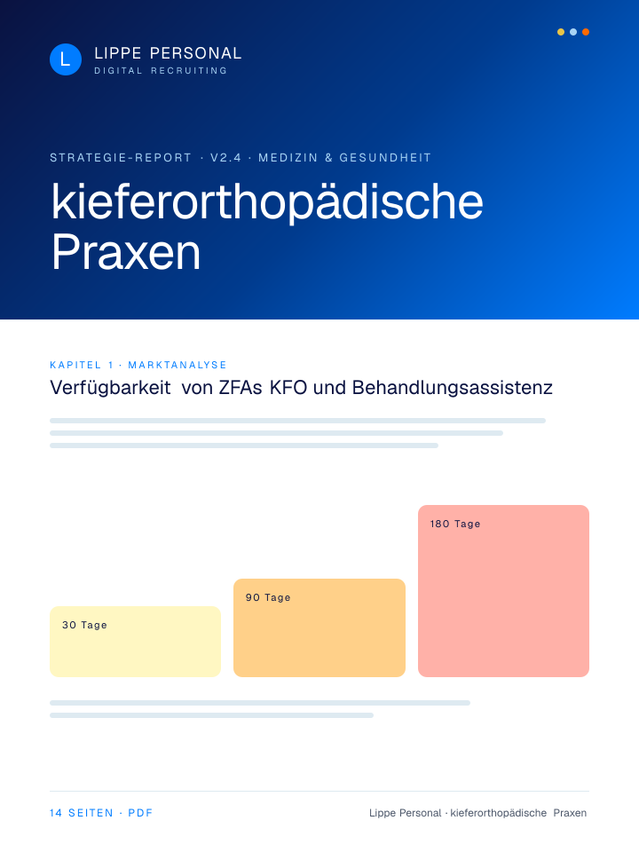 Keine Buzzwords, keine Agentur-Folien. Nur die Zahlen, Vorlagen und der Recruiting-Plan, mit dem kieferorthopädische Praxen aktuell qualifizierte Fachkräfte gewinnen.