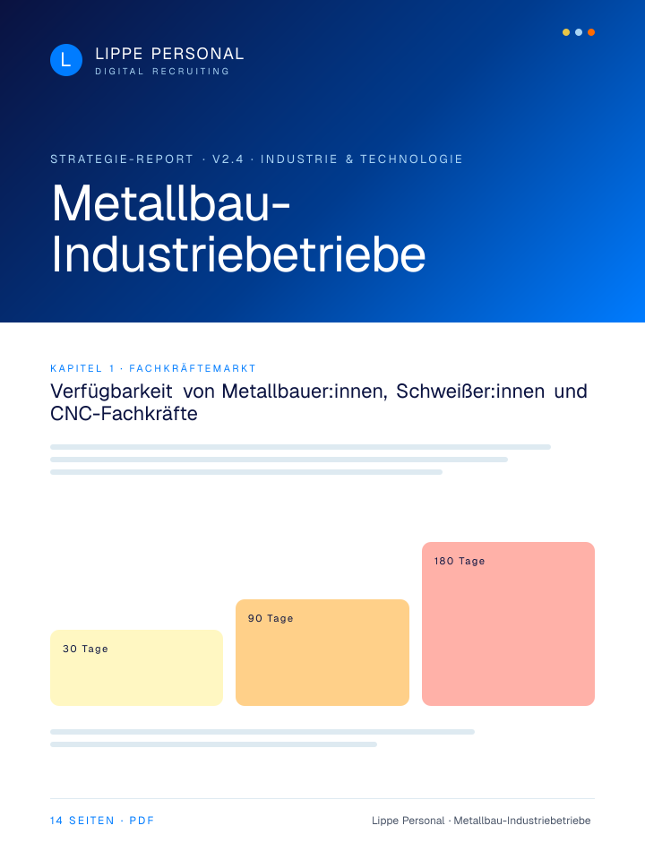 Keine Buzzwords, keine Agentur-Folien. Nur die Zahlen, Vorlagen und der Recruiting-Plan, mit dem Metallbau-Industriebetriebe aktuell qualifizierte Fachkräfte gewinnen.