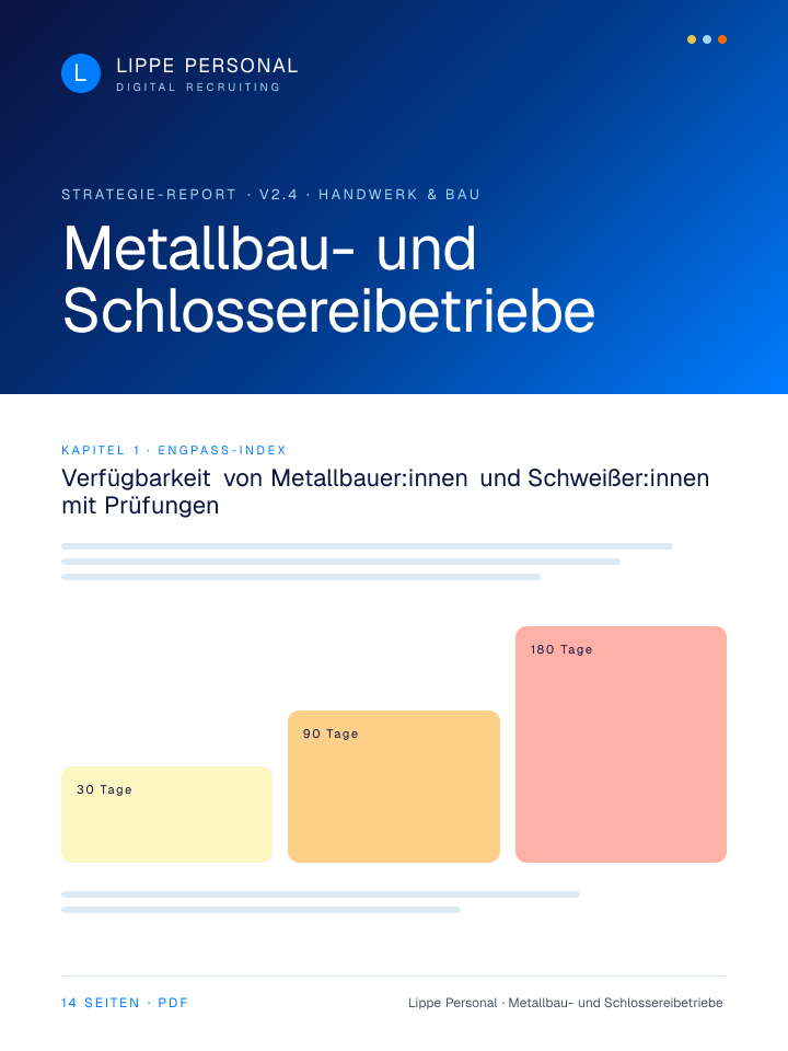 Keine Buzzwords, keine Agentur-Folien. Nur die Zahlen, Vorlagen und der Recruiting-Plan, mit dem Metallbau- und Schlossereibetriebe aktuell qualifizierte Fachkräfte gewinnen.