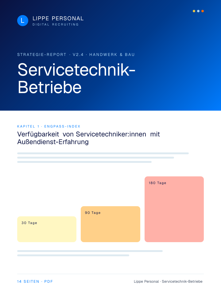 Keine Buzzwords, keine Agentur-Folien. Nur die Zahlen, Vorlagen und der Recruiting-Plan, mit dem Servicetechnik-Betriebe aktuell qualifizierte Fachkräfte gewinnen.