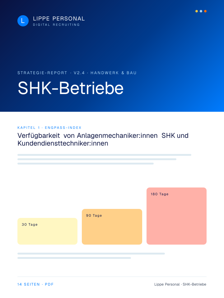 Keine Buzzwords, keine Agentur-Folien. Nur die Zahlen, Vorlagen und der Recruiting-Plan, mit dem SHK-Betriebe aktuell qualifizierte Fachkräfte gewinnen.
