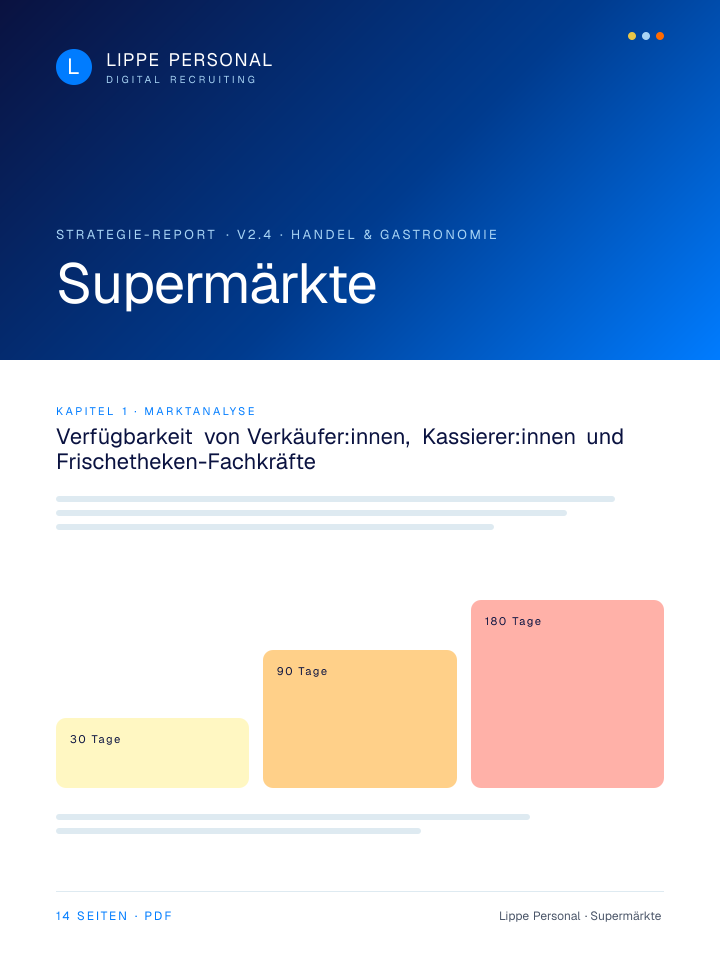 Keine Buzzwords, keine Agentur-Folien. Nur die Zahlen, Vorlagen und der Recruiting-Plan, mit dem Supermärkte aktuell qualifizierte Fachkräfte gewinnen.